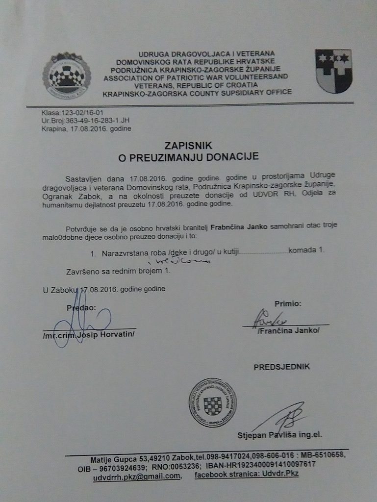 U ime obitelji zahvalila se na donaciji supruga Horvat Jadranka te sinovi Siniša i Mario i sam hrvatski branitelj i aktivni pripadnika HV-a/, a nakon donacije delegaciju donatora obitelj je počastila u svome domu u Hruševcu.